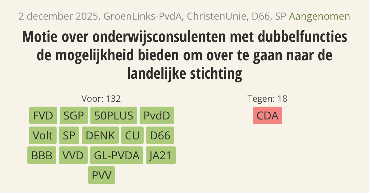 Motie van het lid Westerveld c.s. over onderwijsconsulenten met dubbelfuncties de mogelijkheid bieden om over te gaan naar de landelijke stichting
