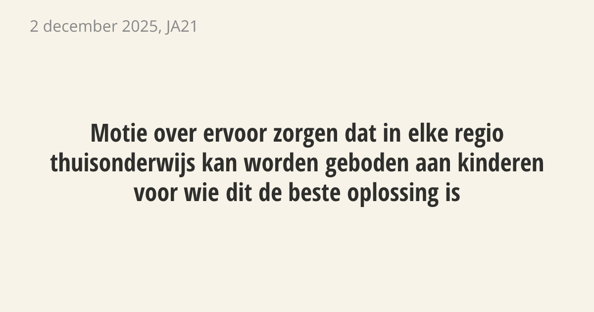 Motie van het lid Boomsma over ervoor zorgen dat in elke regio thuisonderwijs kan worden geboden aan kinderen voor wie dit de beste oplossing is (JA21)