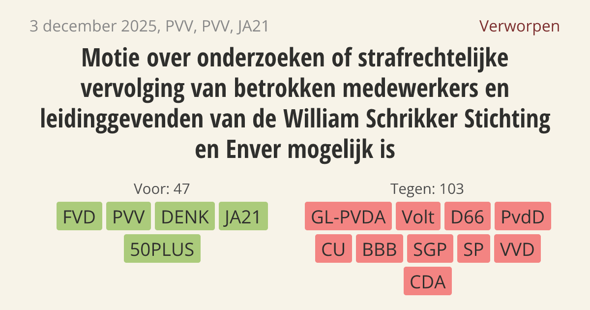 Motie van het lid Van Meetelen c.s. over onderzoeken of strafrechtelijke vervolging van betrokken medewerkers en leidinggevenden van de William Schrikker Stichting en Enver mogelijk is (PVV, PVV, JA21)