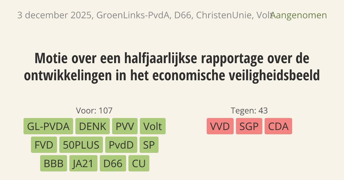 Motie van het lid Van der Lee c.s. over een halfjaarlijkse rapportage over de ontwikkelingen in het economische veiligheidsbeeld (GL-PVDA, D66, CU, Volt)