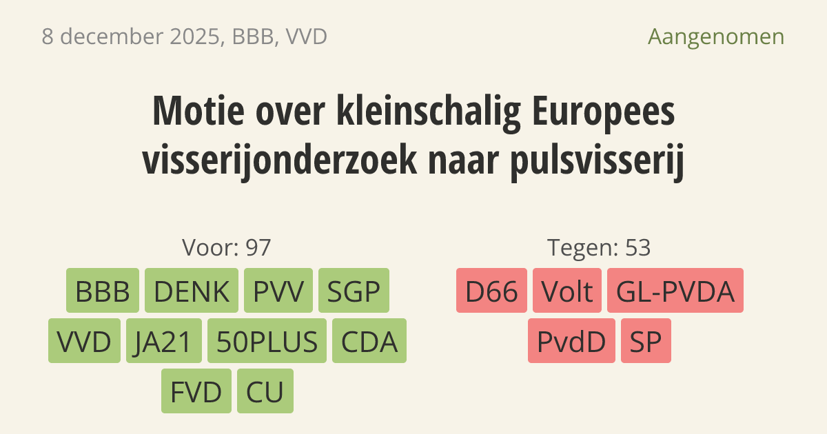 [Motie van de leden Van der Plas en Den Hollander over kleinschalig Europees visserijonderzoek naar pulsvisserij ]