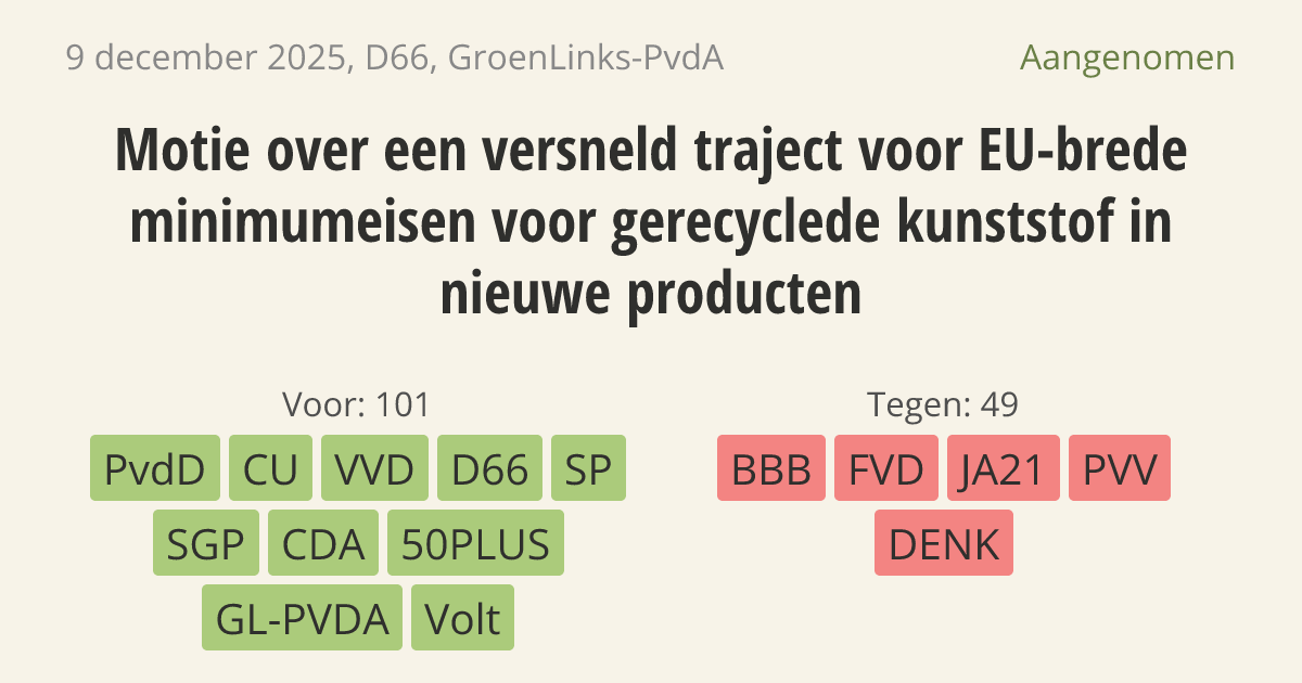 De regering moet in Europa pleiten voor snellere en strengere regels voor het gebruik van tweedehands plastic in nieuwe producten, zoals bouwmaterialen. Nu staat de recyclingsector onder druk. Door fabrikanten te verplichten gerecycled plastic te gebruiken, komt er meer zekerheid voor bedrijven om te investeren in goede verwerkingsinstallaties.