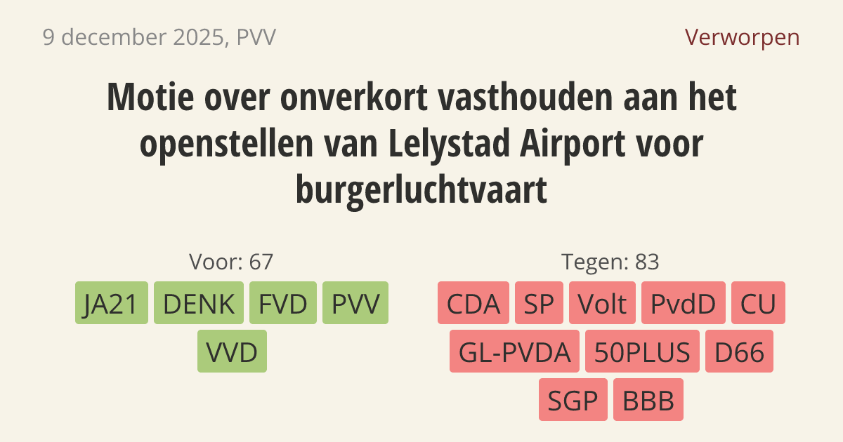 De regering moet Lelystad Airport openstellen voor de burgerluchtvaart. Hierdoor ontstaat op Schiphol meer ruimte voor overstapvluchten. Nederland heeft extra plek nodig voor vakantievluchten en Lelystad Airport is daarvoor de juiste locatie. Daarnaast zorgt de opening van de luchthaven voor meer banen en inkomsten in de regio.