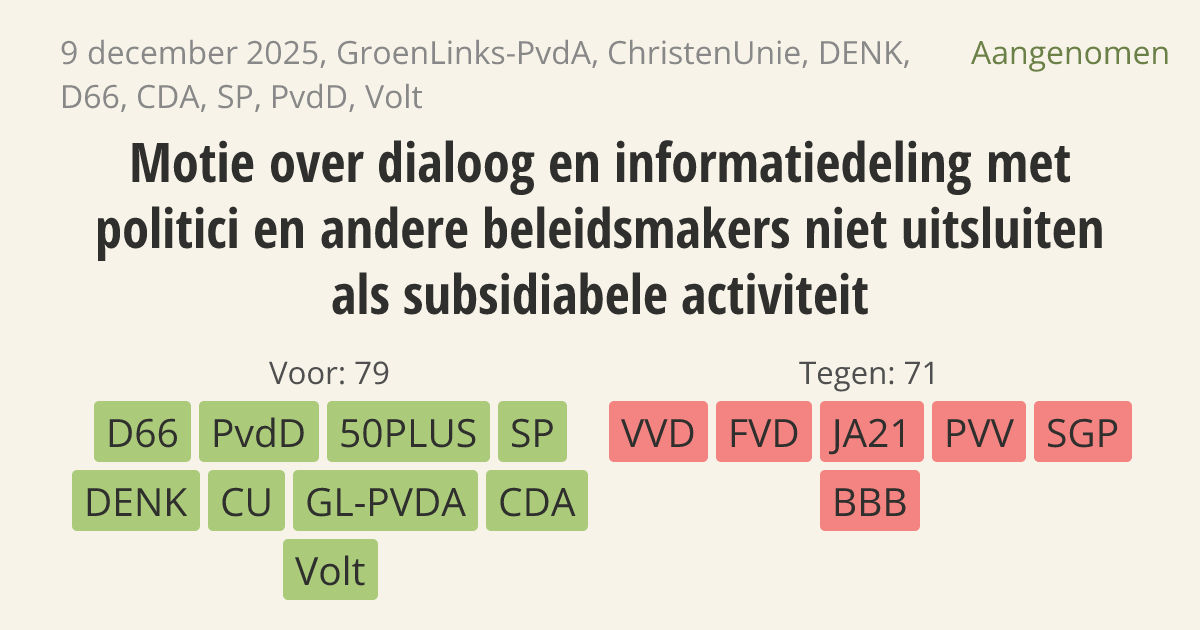 Motie van het lid Kröger c.s. over dialoog en informatiedeling met politici en andere beleidsmakers niet uitsluiten als subsidiabele activiteit