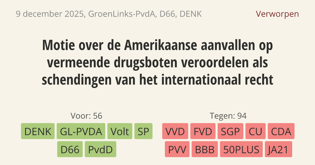 Het kabinet moet de Amerikaanse aanvallen op boten die drugs zouden vervoeren officieel afkeuren. Bij deze aanvallen zijn al 87 doden gevallen. Volgens de Kamer zijn deze acties een schending van het internationaal recht.