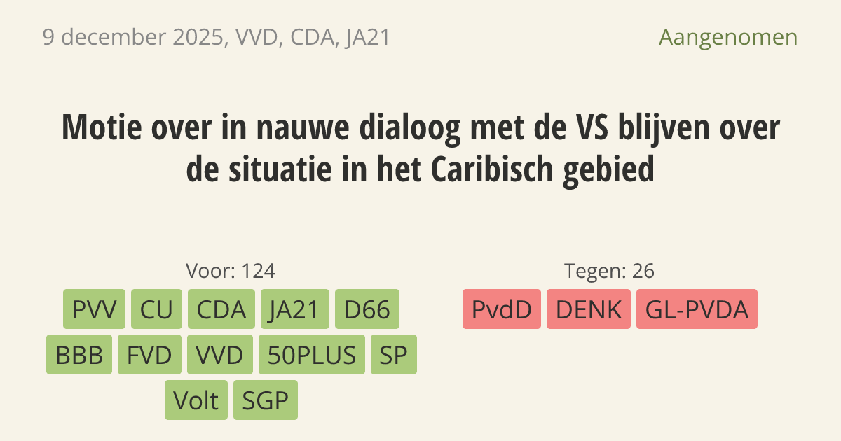 De regering moet met de Verenigde Staten in gesprek blijven over hun militaire acties tegen drugssmokkelaars uit Venezuela. De Amerikaanse operaties moeten volgens de internationale regels verlopen. Dit is nodig om de veiligheid in de Caribische delen van het Koninkrijk te beschermen en om te voorkomen dat er grote groepen vluchtelingen deze kant op komen.