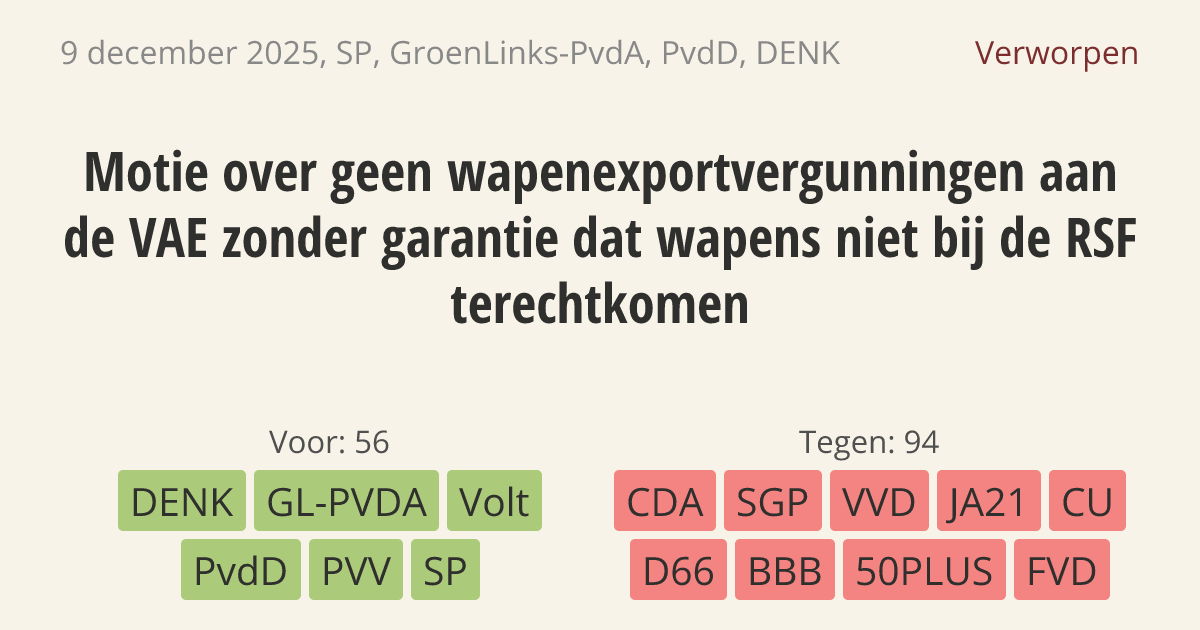 De regering mag geen wapens meer leveren aan de Verenigde Arabische Emiraten. Het risico is momenteel te groot dat deze wapens via Nederland terechtkomen bij de RSF-militie in Sudan.
