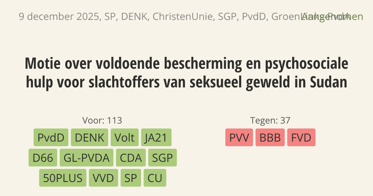 De regering moet zorgen voor betere bescherming en psychologische hulp voor slachtoffers van seksueel geweld in Sudan. Er moet indien nodig extra geld naar deze hulp toe. In Sudan wordt seksueel geweld nu op grote schaal gebruikt als wapen, terwijl er te weinig steun is voor de slachtoffers.