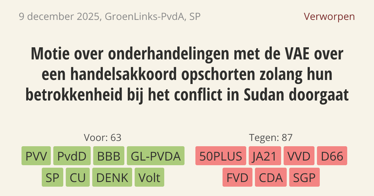 Het kabinet moet de onderhandelingen over een nieuw EU-handelsakkoord met de Verenigde Arabische Emiraten laten stopzetten. Dit land levert wapens aan de RSF-militie en smokkelt goud in Sudan. Daarmee dragen de Emiraten bij aan ernstige schendingen van mensenrechten. Opschorting van het handelsverdrag is nodig om veilige vluchtroutes en hulp voor burgers in Sudan af te dwingen.