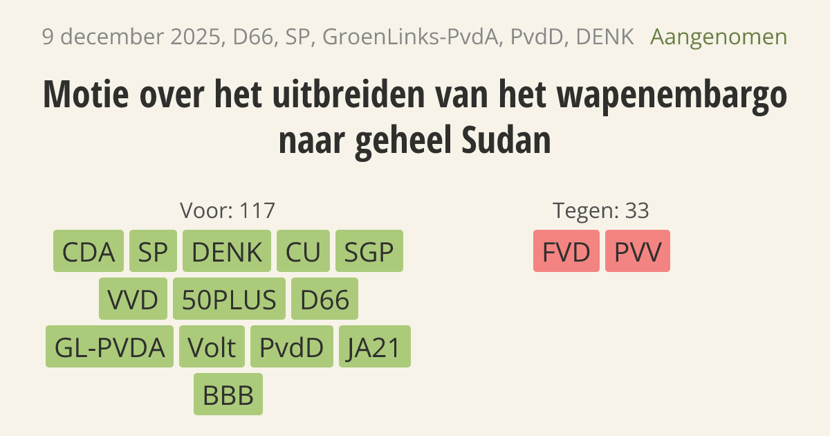 Het kabinet moet in internationaal verband pleiten voor een wapenembargo voor heel Sudan en voor strengere controle op smokkelroutes. Op dit moment gaan de bloederige gevechten tegen burgers door omdat strijdende partijen nog steeds gemakkelijk aan wapens kunnen komen.