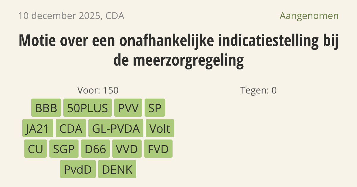 De regering moet onderzoeken of onafhankelijke deskundigen kunnen bepalen of iemand recht heeft op de meerzorgregeling. Dit is extra geld voor mensen die veel meer zorg nodig hebben dan gemiddeld. Op dit moment bepalen de zorgkantoren zelf of ze dit geld uitkeren. Een onafhankelijke toets helpt om de echte zorgbehoefte beter en eerlijker vast te stellen.