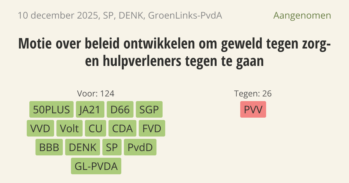 De regering moet geweld tegen zorg- en hulpverleners strenger aanpakken en daders vaker vervolgen. Het aantal slachtoffers is de afgelopen jaren extreem gestegen. Er moet meer geld komen voor onderzoek en de Wet internationale misdrijven moet worden aangepast. Zo kunnen daders van geweld tegen hulpverleners ook in Nederland worden gestraft als zij een indirecte band met ons land hebben.