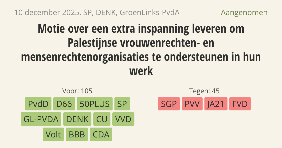 De regering moet meer doen om Palestijnse vrouwenrechten- en mensenrechtenorganisaties te ondersteunen. Deze organisaties zijn onmisbaar voor vrede, maar worden ernstig belemmerd omdat de Verenigde Staten en Europa op hen bezuinigen.