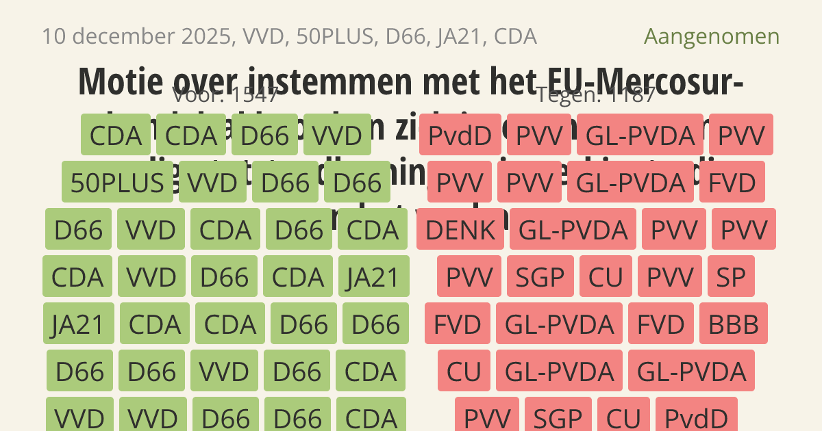 De regering moet instemmen met het handelsverdrag tussen de EU en de Mercosur-landen. Dit akkoord is belangrijk voor de economie en de toegang tot kritieke grondstoffen. Deze grondstoffen zijn onmisbaar voor de Nederlandse energie- en defensiesector. Door de afnemende stabiliteit in de wereld moet Nederland zijn economische positie versterken via dit soort internationale afspraken.