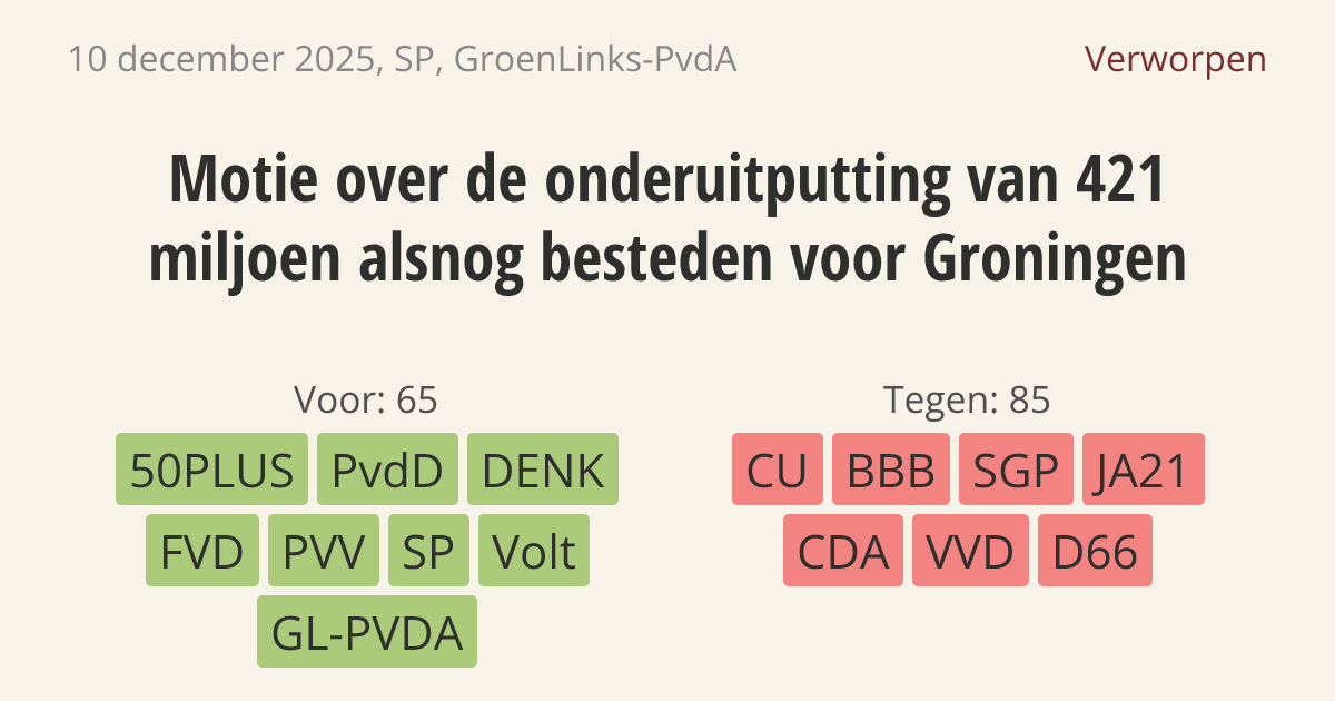 De regering moet een plan maken om 421 miljoen euro alsnog aan Groningen uit te geven. Dit bedrag is nu overgebleven op de begroting. Het is onterecht dat de regering de schuld hiervan bij de bewoners legt, terwijl de uitvoering door de overheid zelf tekortschiet. Ook moet de regering voorkomen dat er in de toekomst opnieuw geld voor Groningen blijft liggen.