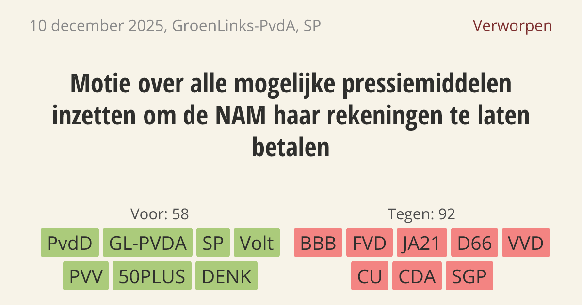 De regering moet de NAM (Nederlandse Aardolie Maatschappij) direct dwingen om alle openstaande rekeningen voor de versterking van huizen in Groningen te betalen. De NAM weigert sinds 2020 veel facturen te betalen en dat is een belediging voor de inwoners. De overheid moet daarom alle gesprekken stoppen, juridische stappen ondernemen en geen nieuwe vergunningen meer aan het bedrijf geven.