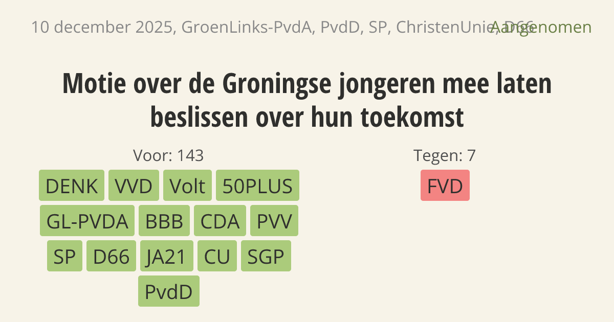 De regering moet een plan maken waardoor Groningse jongeren voortaan echt kunnen meebeslissen over hun eigen toekomst. De gaswinning veroorzaakt bij hen veel stress en mentale problemen. Op dit moment voelen deze jongeren zich niet gehoord en hebben zij te weinig invloed op besluiten die hen aangaan.