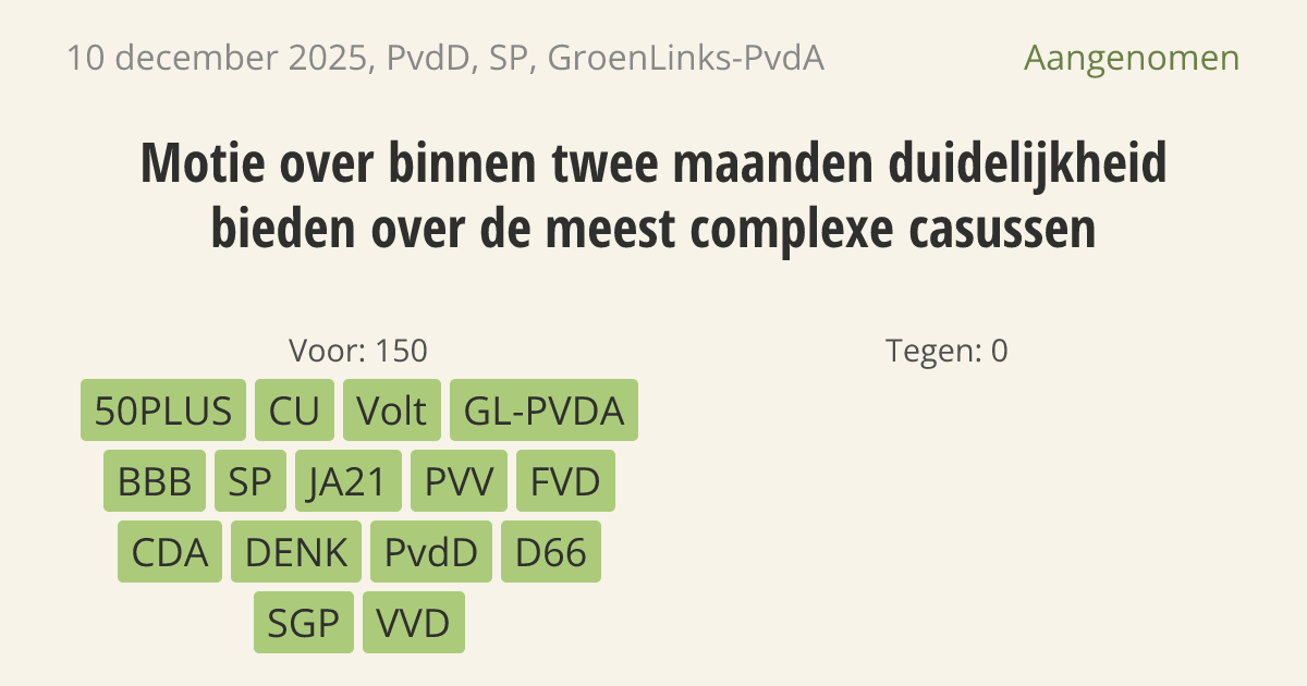 Motie van het lid Teunissen c.s. over binnen twee maanden duidelijkheid bieden over de meest complexe casussen