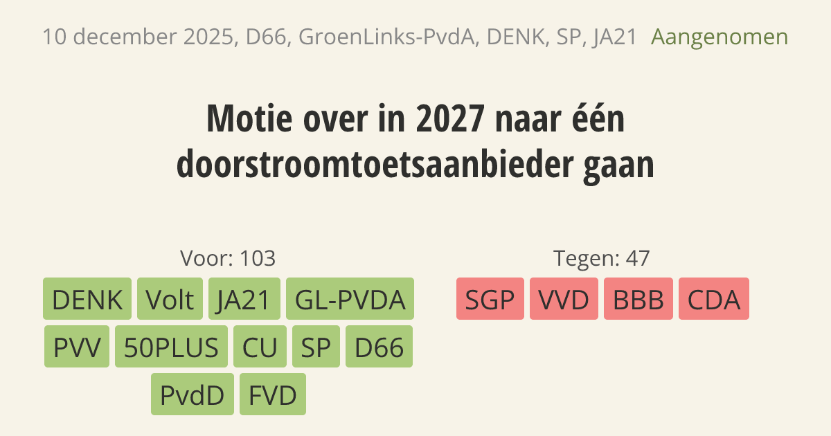 Motie van het lid Rooderkerk c.s. over in 2027 naar één doorstroomtoetsaanbieder gaan