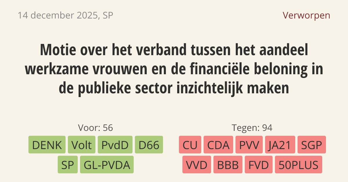 De regering moet onderzoek doen naar het verband tussen lage salarissen en het aantal vrouwen in de publieke sector. Ook moet de regering plannen maken om de loonkloof te dichten. Vrouwen verdienen gemiddeld nog steeds 10,5% minder dan mannen. Dit komt onder andere doordat beroepen waarin veel vrouwen werken, zoals de zorg, relatief slecht betalen.