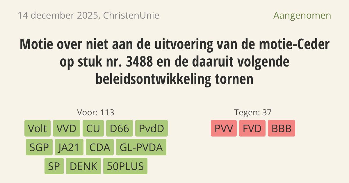 Motie van het lid Ceder over niet aan de uitvoering van de motie-Ceder op stuk nr. 3488 en de daaruit volgende beleidsontwikkeling tornen