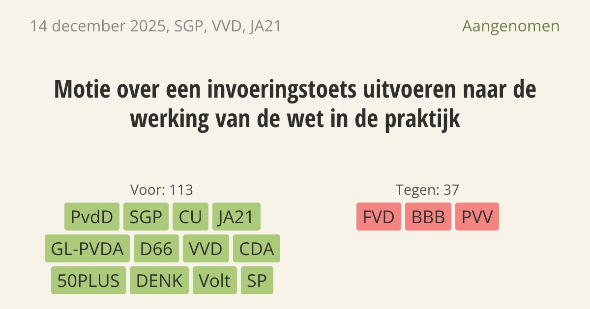Motie van het lid Diederik van Dijk c.s. over een invoeringstoets uitvoeren naar de werking van de wet in de praktijk