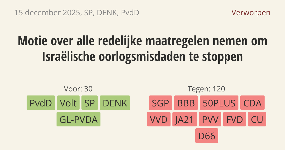 De regering moet strengere maatregelen nemen om oorlogsmisdaden door Israël te stoppen. Daarom moet Nederland de Europese handelsafspraken en het belastingverdrag met Israël stopzetten. Ook moeten er persoonlijke sancties komen voor Israëlische bewindslieden en moet de wapenexport direct ophouden. Israël blokkeert nu humanitaire hulp en er is een groot risico op genocide.