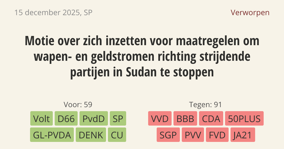 De regering moet zich tijdens de Europese top inzetten voor maatregelen die de stroom van wapens en geld naar strijdende partijen in Soedan stoppen. Ook moeten er strafmaatregelen komen voor landen die deze partijen steunen. Dit is nodig om de gewelddadige strijd in het land te beëindigen.