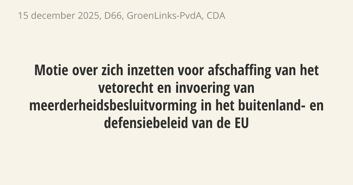 De regering moet zich binnen de Europese Unie inzetten voor het afschaffen van het vetorecht bij besluiten over veiligheid en buitenlands beleid. Nu kunnen landen zoals Hongarije belangrijke beslissingen, zoals steun aan Oekraïne of sancties tegen Rusland, alleen tegenhouden. Dit ondermijnt de geloofwaardigheid en slagkracht van de Europese Unie tijdens internationale crises.