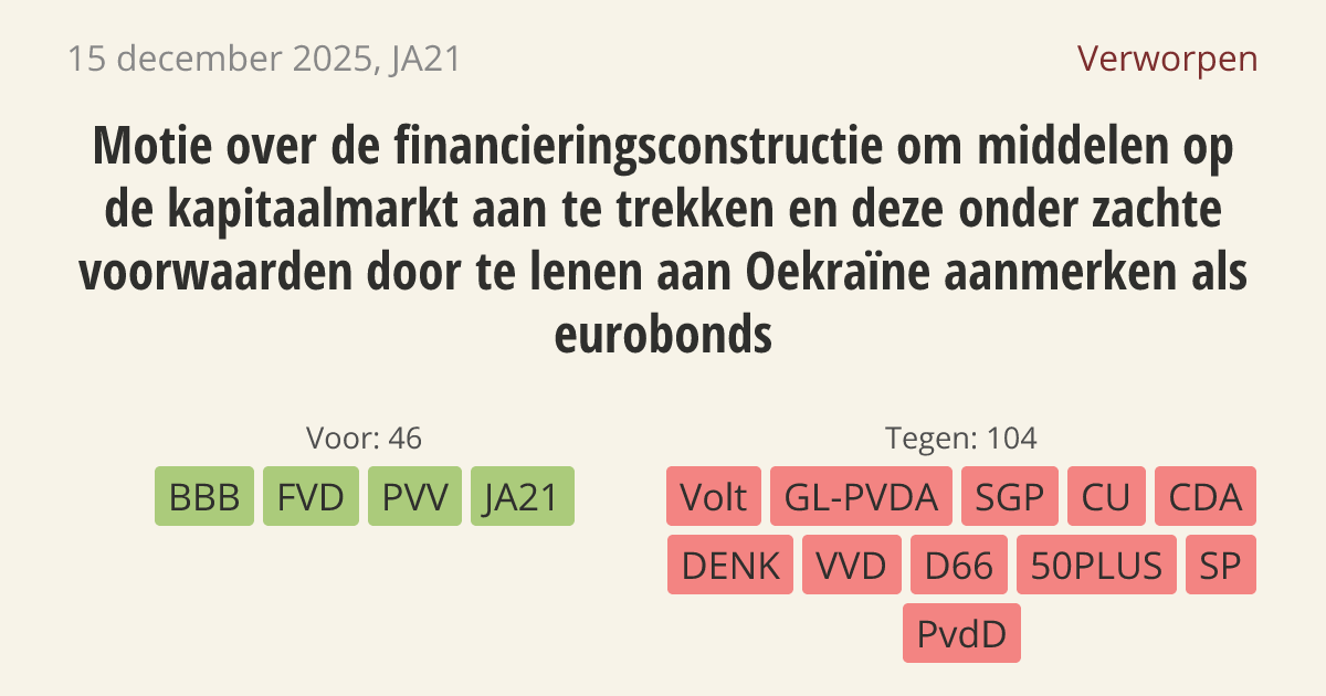 De regering moet de nieuwe financieringsmethode voor Oekraïne officieel bestempelen als eurobonds. De Europese Unie leent hiervoor samen geld op de kapitaalmarkt. De lidstaten dragen hierdoor gezamenlijk de financiële risico's en schulden. Dit zijn de kenmerken van eurobonds, ongeacht de woorden die het kabinet nu gebruikt.