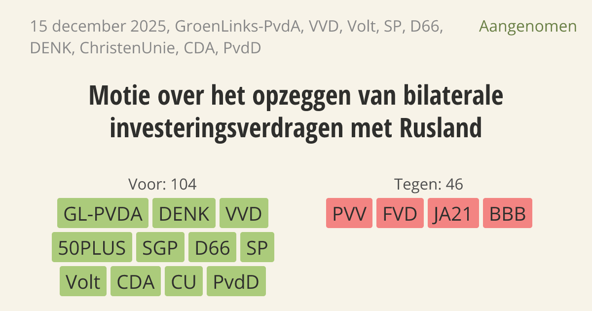 De regering moet het investeringsverdrag met Rusland opzeggen en andere Europese landen oproepen hetzelfde te doen. Dit voorkomt dat Russische investeerders in de toekomst nog schadeclaims tegen de Nederlandse staat kunnen indienen via speciale geschillenregels.