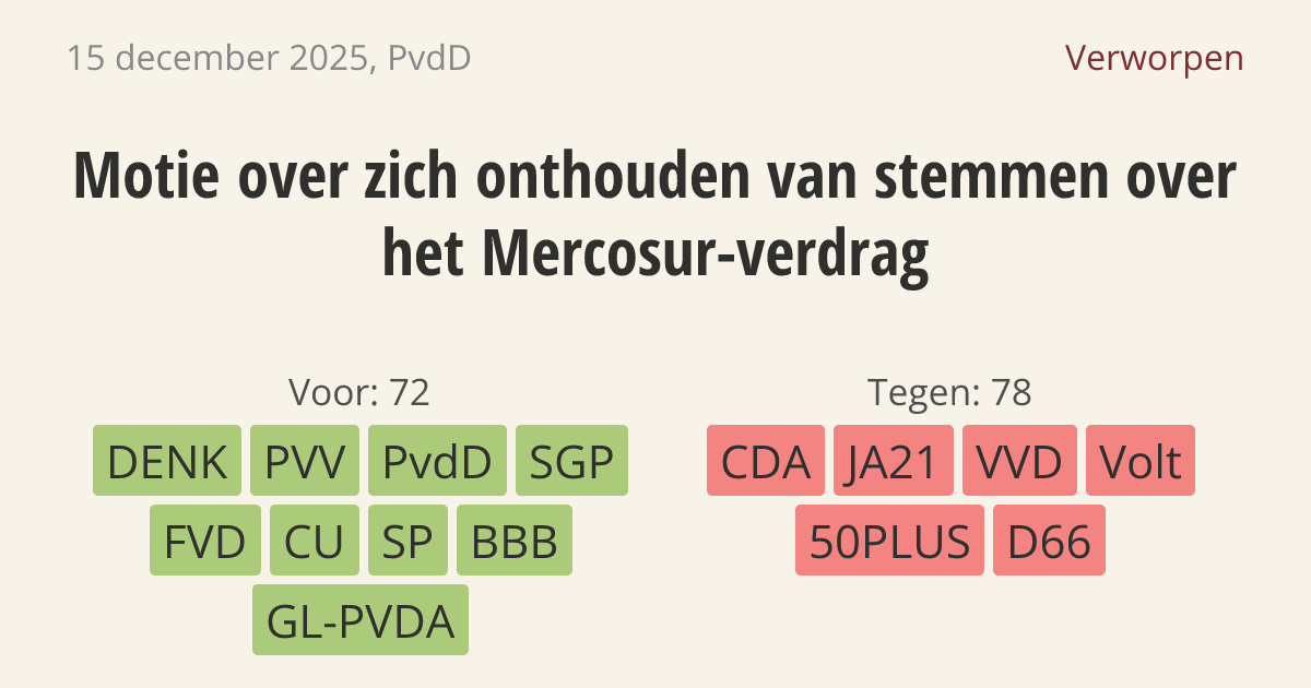 De regering moet zich onthouden van stemming over het Mercosur-handelsverdrag. Het parlement is erg verdeeld over dit verdrag. Daarnaast brengt de import van goedkopere producten met lagere regels voor duurzaamheid en dierenwelzijn risico's met zich mee voor de Nederlandse boeren.