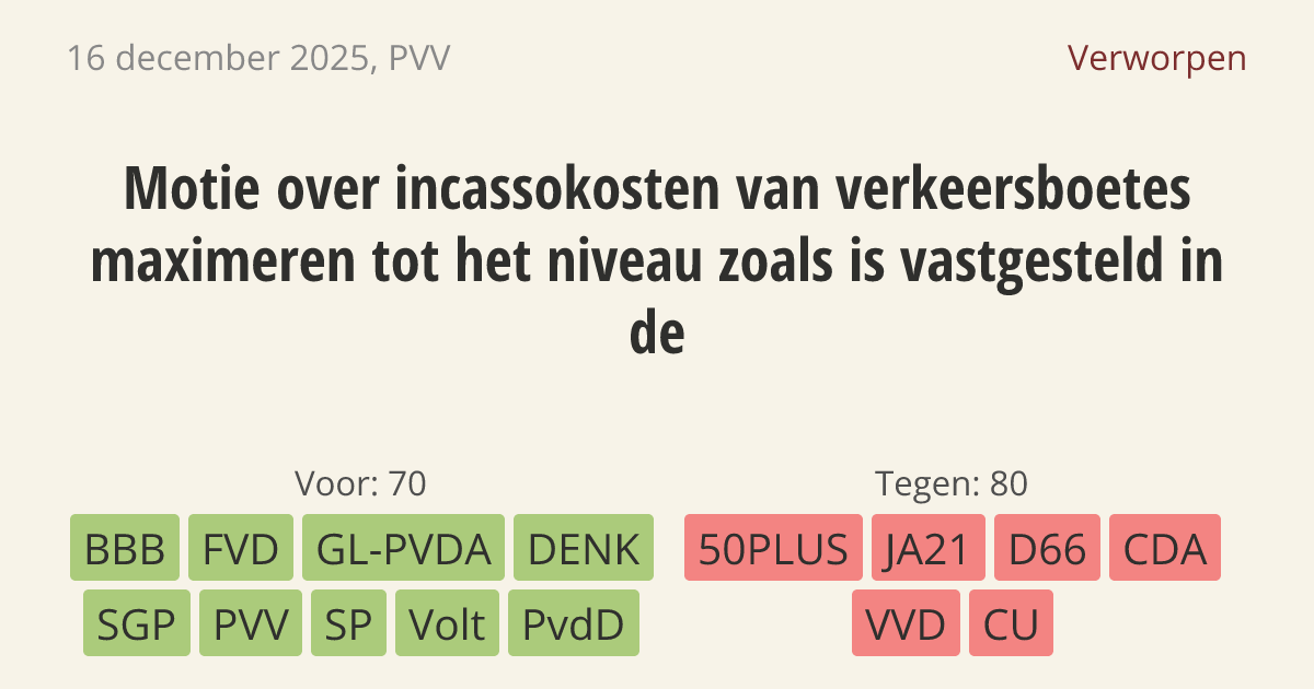 Motie van het lid Tony van Dijck over incassokosten van verkeersboetes maximeren tot het niveau zoals is vastgesteld in de