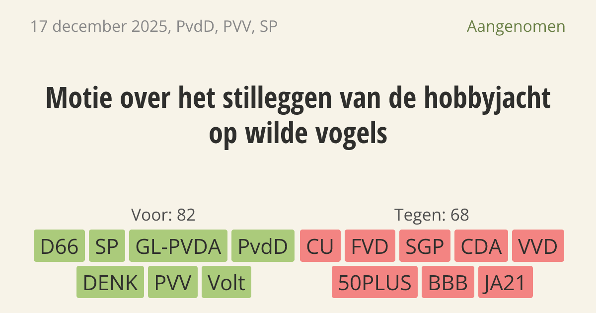 verzoekt de regering om de hobbyjacht op wilde vogels stil te leggen.