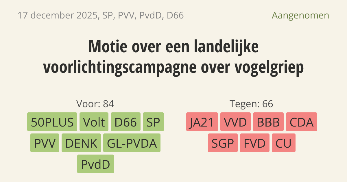 De regering moet een landelijke campagne starten over vogelgriep. Burgers moeten weten wat zij moeten doen als zij dode of zieke vogels vinden. Dit is nodig omdat vogelgriep risico's meebrengt voor de gezondheid van mens en dier.