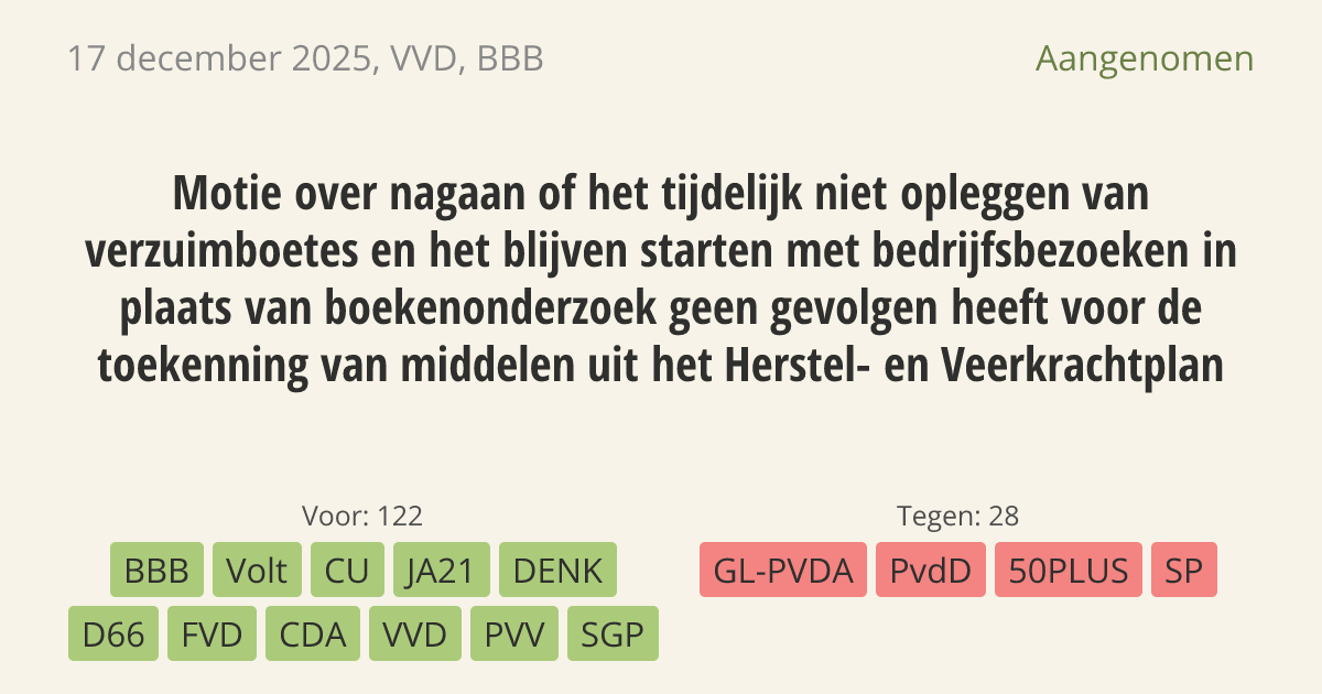 Motie van de leden Martens-America en Vermeer over nagaan of het tijdelijk niet opleggen van verzuimboetes en het blijven starten met bedrijfsbezoeken in plaats van boekenonderzoek geen gevolgen heeft voor de toekenning van middelen uit het Herstel- en Veerkrachtplan