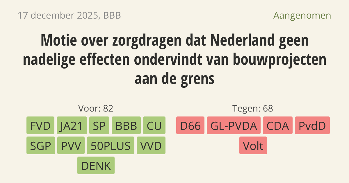 De regering moet ervoor zorgen dat Nederland geen last krijgt van bouwprojecten vlak over de grens, zoals grote windmolens. De bouwplannen van Duitsland zorgen nu voor onrust bij omwonenden en kunnen de Nederlandse natuur beschadigen. Volgens internationale afspraken moeten buurlanden vooraf overleggen over de gevolgen voor het milieu.