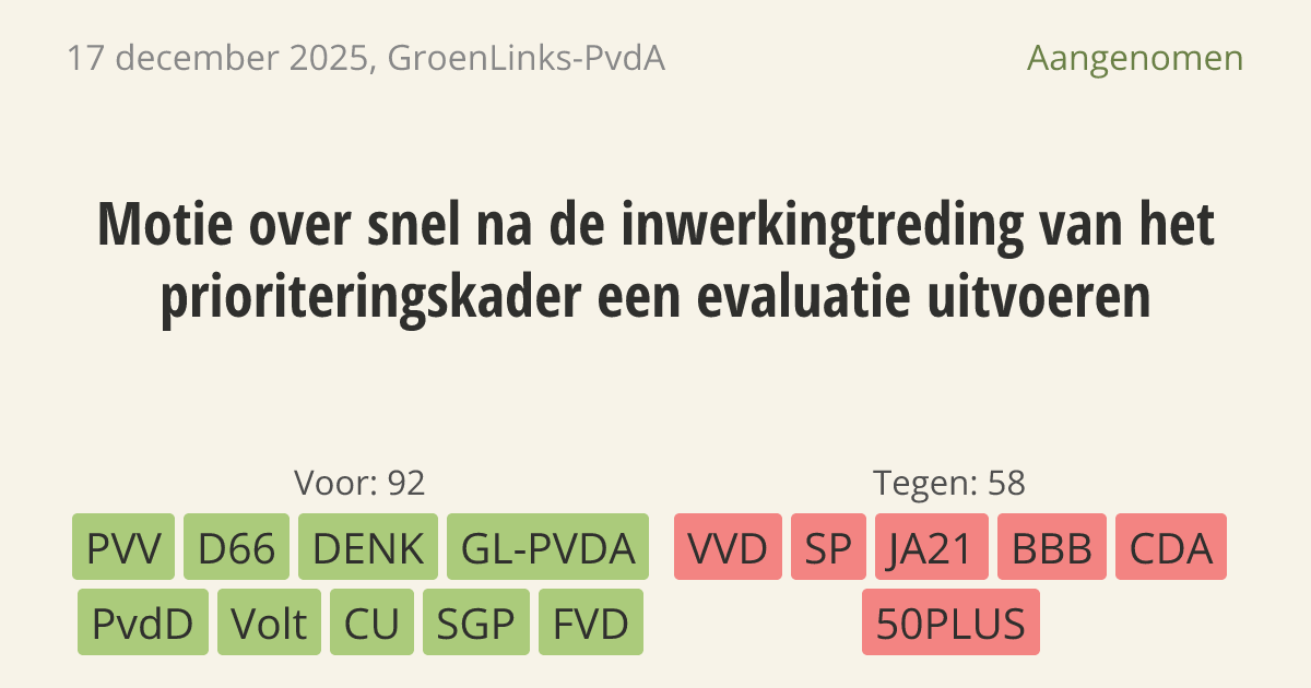 Motie van het lid Van Oosterhout over snel na de inwerkingtreding van het prioriteringskader een evaluatie uitvoeren