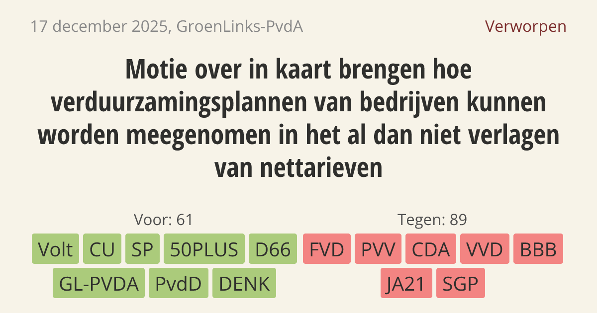 Motie van het lid Van Oosterhout over in kaart brengen hoe verduurzamingsplannen van bedrijven kunnen worden meegenomen in het al dan niet verlagen van nettarieven