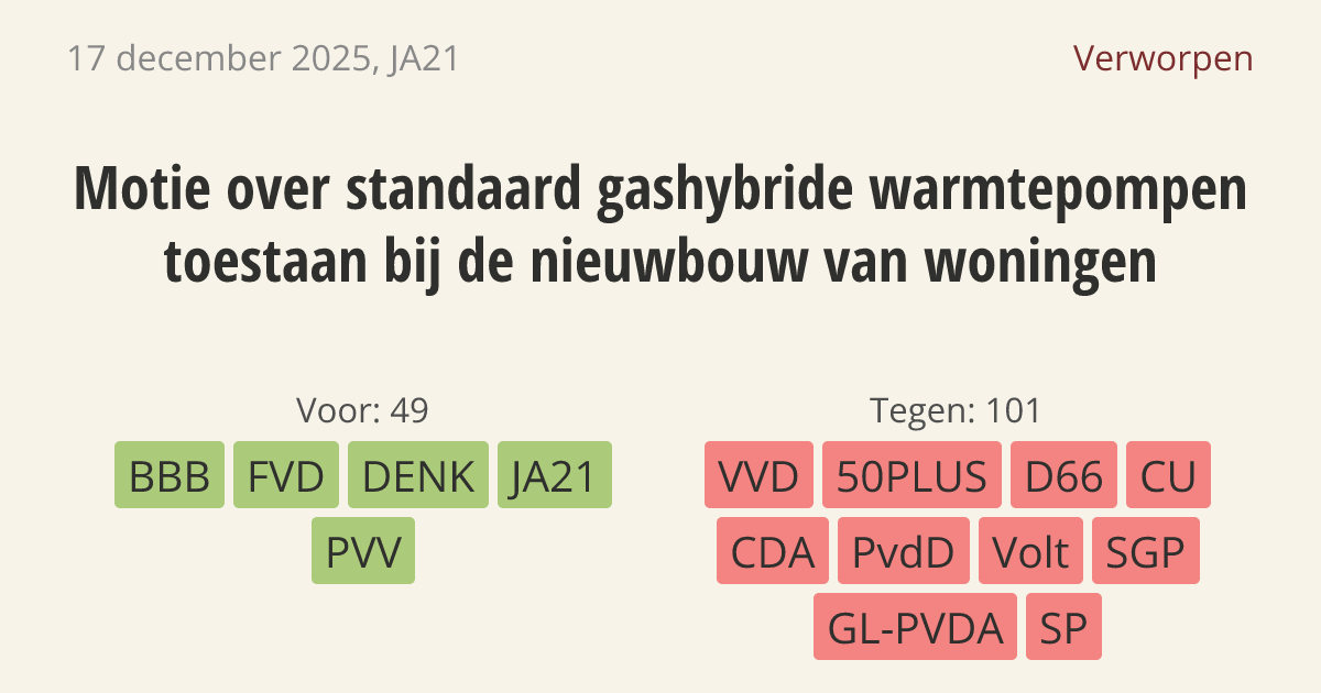Motie van het lid Van den Berg over standaard gashybride warmtepompen toestaan bij de nieuwbouw van woningen