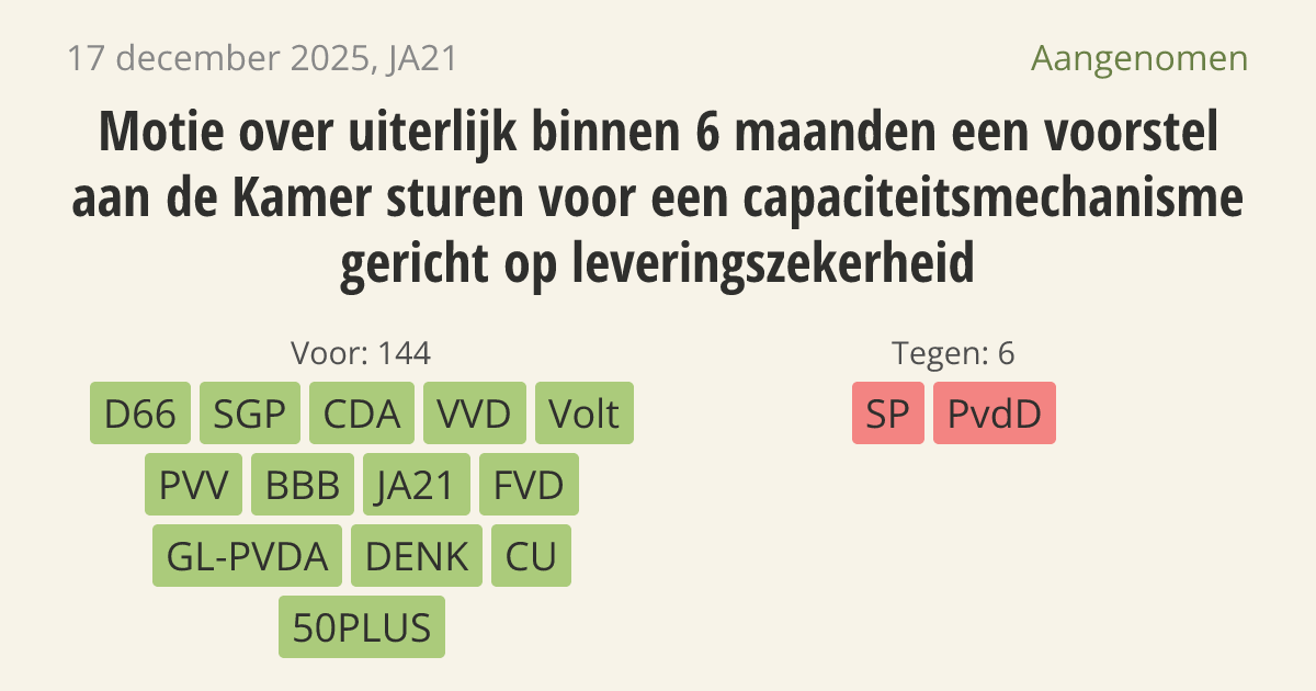 De regering moet een plan maken voor een capaciteitsmechanisme. Dit is een vergoeding voor energiecentrales om beschikbaar te blijven, ook als ze niet draaien. Nu dreigen gascentrales te sluiten omdat ze te weinig verdienen. Zonder deze centrales ontstaan er tekorten op het stroomnet tijdens piekmomenten.