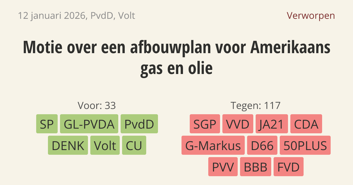De regering moet een plan maken om stap voor stap te stoppen met de import van gas en olie uit de Verenigde Staten. Nederland moet voor deze grondstoffen niet meer afhankelijk zijn van andere landen. Door de huidige situatie in de wereld is deze onafhankelijkheid extra belangrijk geworden.