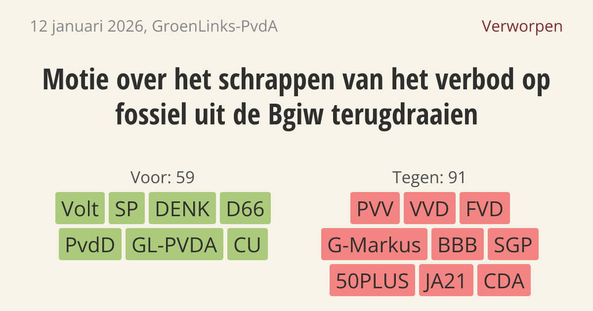 De regering moet het verbod op fossiele brandstoffen in de Bgiw behouden. Dit is een wet die regels stelt voor de bouw en het gebruik van infrastructuur. Nederland moet namelijk uiterlijk in 2050 klimaatneutraal zijn. Duidelijke afspraken zijn hard nodig voor bedrijven die willen investeren en voor alle andere betrokken partijen.