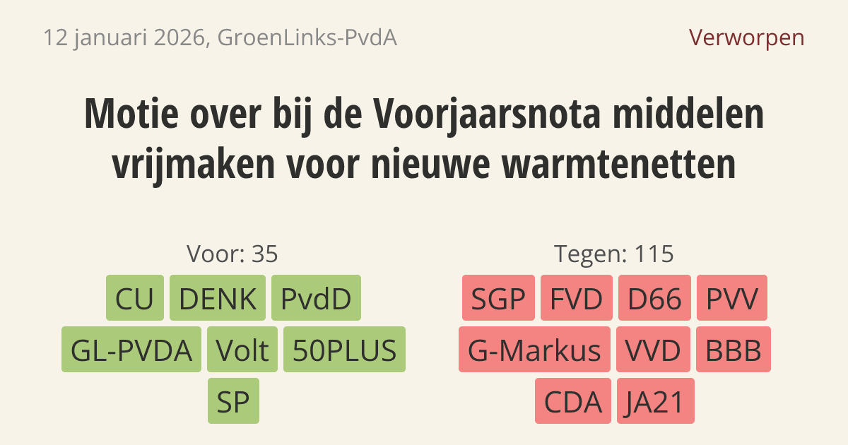 De regering moet geld vrijmaken voor de Stimuleringsregeling aardgasvrije huurwoningen. Voor het jaar 2026 is er nu geen budget. Zonder dit geld kunnen projecten voor warmtenetten niet doorgaan. Hierdoor lopen duizenden huishoudens een betaalbaar alternatief voor koken en stoken op gas mis.
