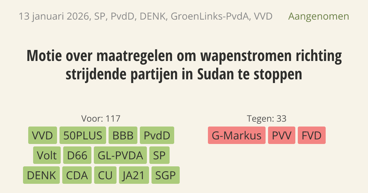 De regering moet maatregelen nemen om de stroom van wapens naar strijdende groepen in Sudan te stoppen. Ook moet de regering het eigen Nederlandse exportbeleid strenger controleren. Dit voorkomt dat wapens via Nederland per ongeluk toch in handen komen van partijen die in Sudan vechten.