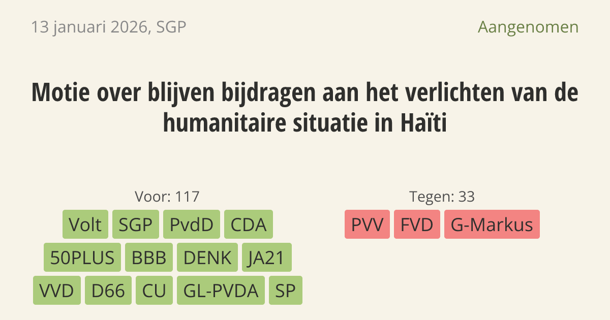 De regering moet via internationale organisaties zoals het Rode Kruis en UNICEF blijven meehelpen om de nood in Haïti te verlichten. Ook moet de regering aandringen op extra hulpmaatregelen. Dit is nodig omdat gewapende bendes het land terroriseren en meer dan de helft van de bevolking te weinig te eten heeft.