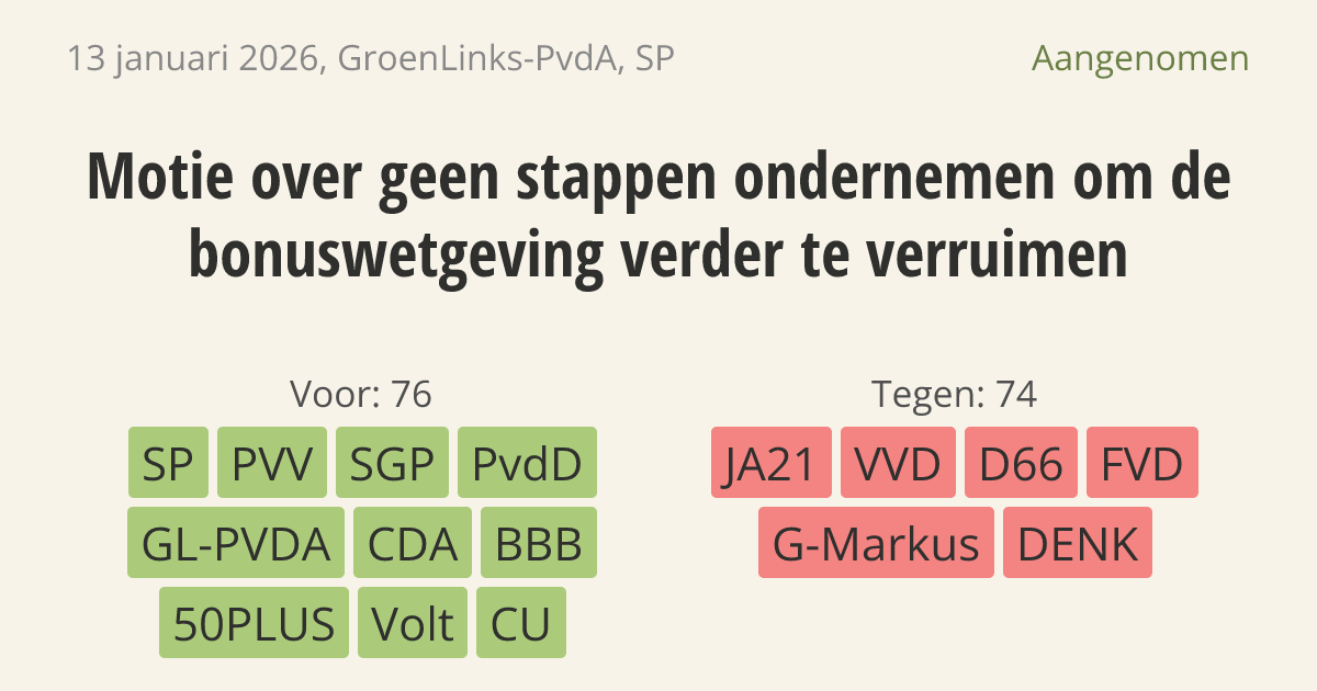 Motie van de leden Bushoff en Jimmy Dijk over geen stappen ondernemen om de bonuswetgeving verder te verruimen