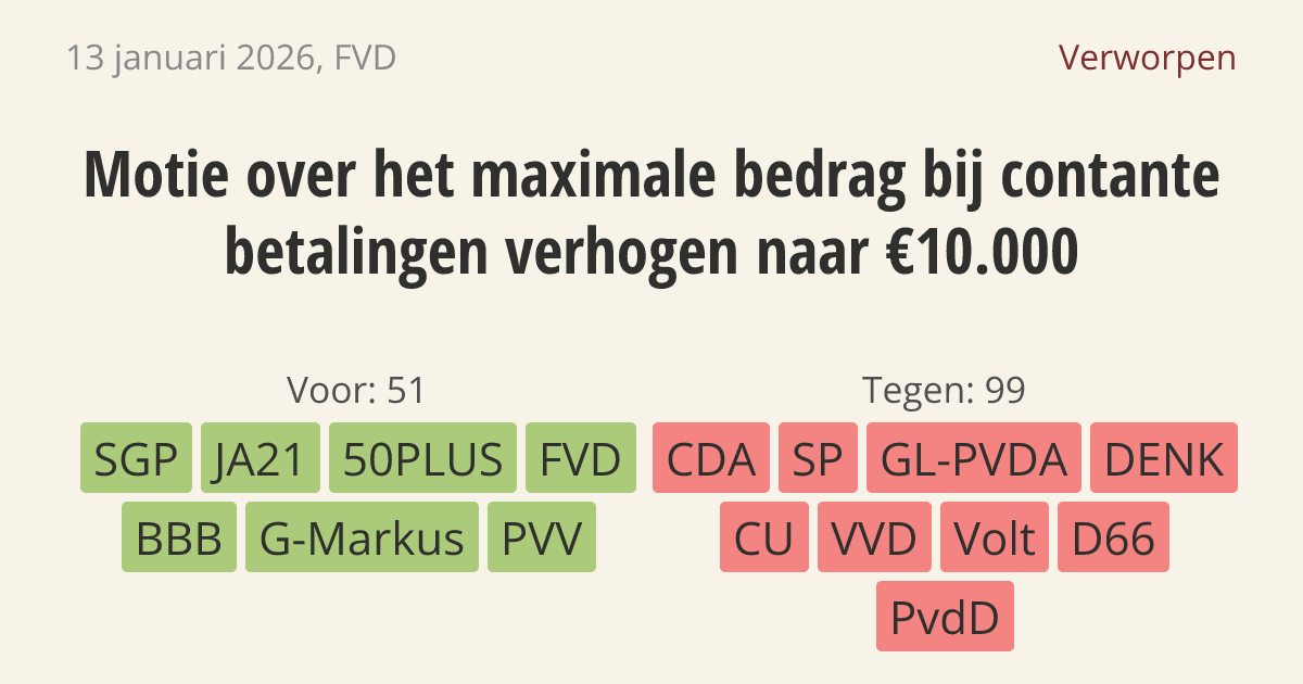 Motie van het lid Dekker over het maximale bedrag bij contante betalingen verhogen naar €10.000