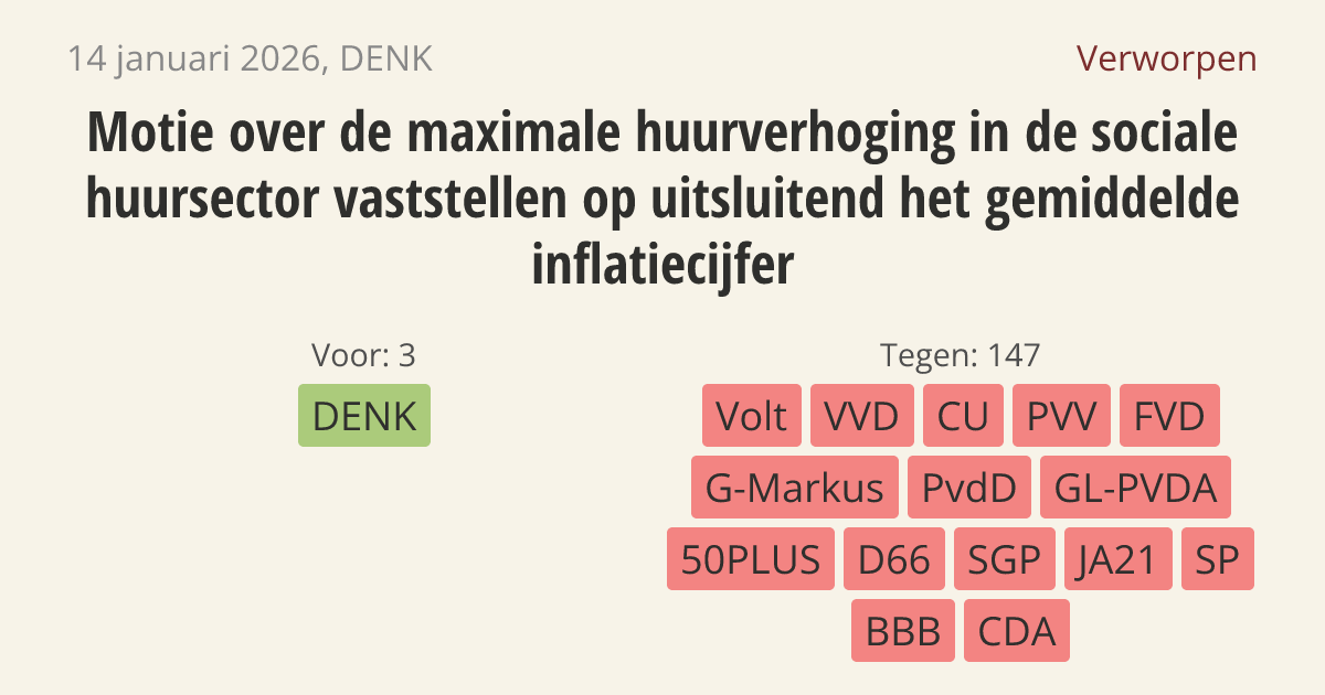De regering moet de extra huurverhoging van 0,5 procent in de sociale huursector schrappen. Vanaf juli 2026 mag de huur dan alleen nog stijgen met het gemiddelde inflatiecijfer. De extra verhoging zorgt namelijk voor onnodig hoge woonlasten voor huurders. Alleen het inflatiecijfer gebruiken geeft genoeg stabiliteit voor de toekomst.