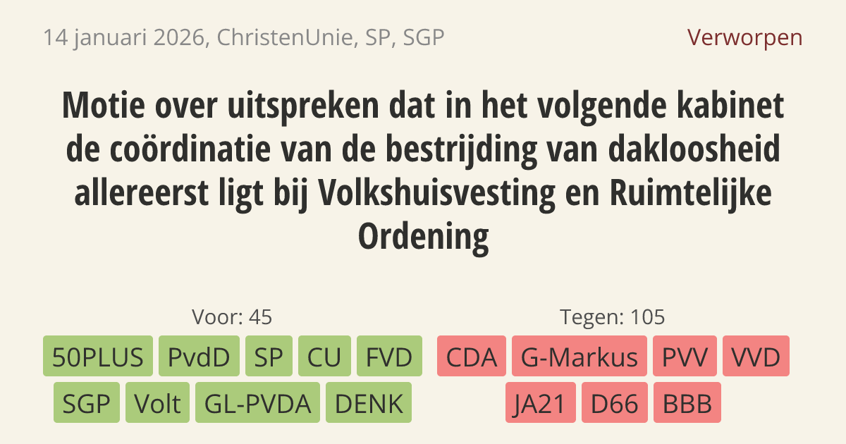 Motie van het lid Grinwis c.s. over uitspreken dat in het volgende kabinet de coördinatie van de bestrijding van dakloosheid allereerst ligt bij Volkshuisvesting en Ruimtelijke Ordening